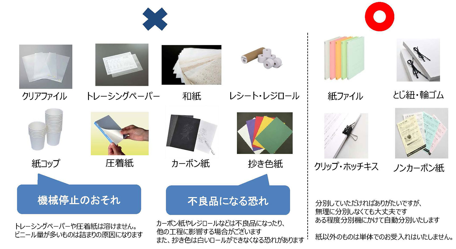 OK: 紙ファイル、とじ紐・輪ゴム、クリップ・ホッチキス、ノンカーボン紙